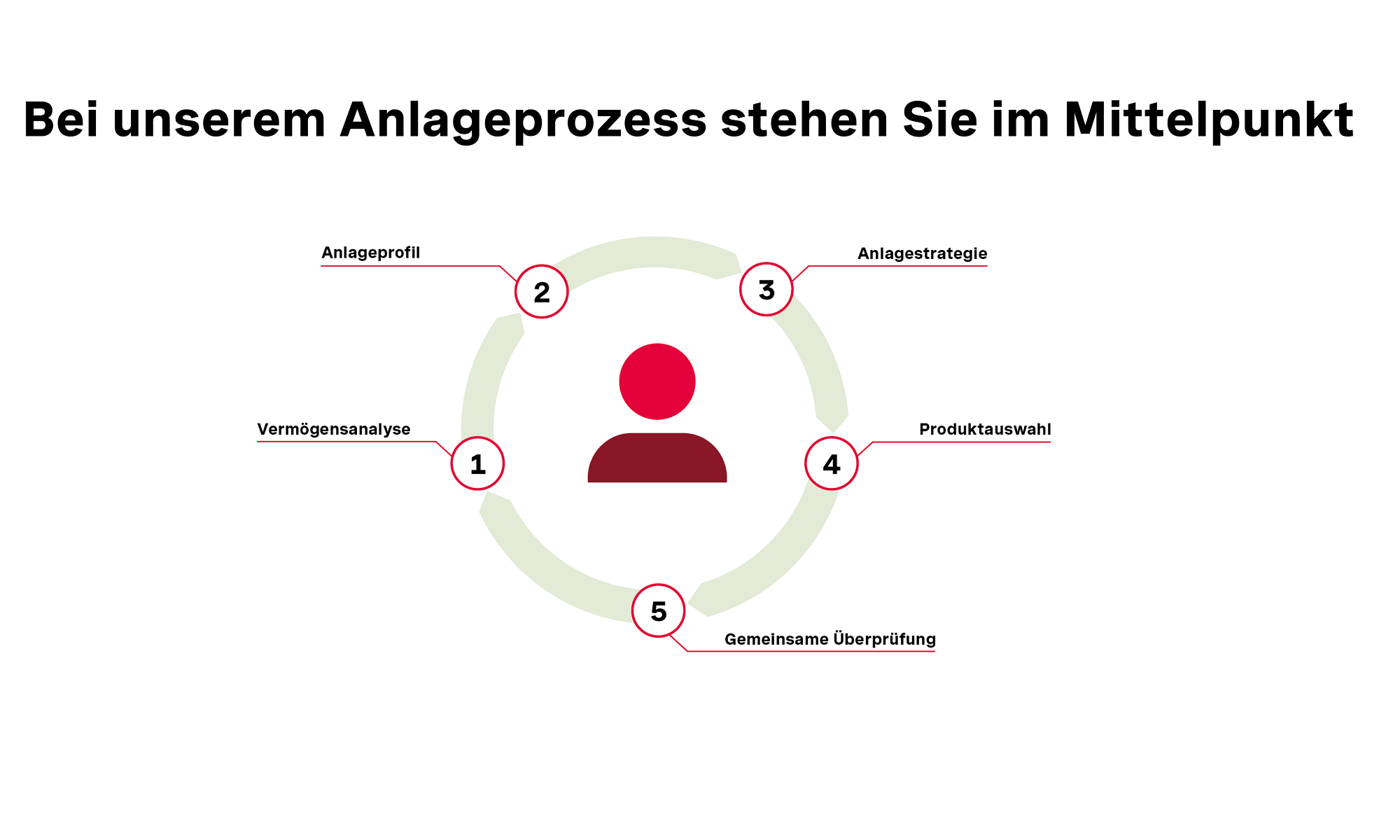 In der Anlageberatung stehen Sie jederzeit im Zentrum. In einem ausführlichen Beratungsgespräch besprechen Sie mit Ihrem Finanzcoach zunächst Ihre persönlichen Ziele und Bedürfnisse. Anschliessend begleitet Ihre Beraterin oder Ihr Berater Sie Schritt für Schritt durch unseren Anlageprozess, stets mit Ihren Bedürfnissen und Zielen im Blick.