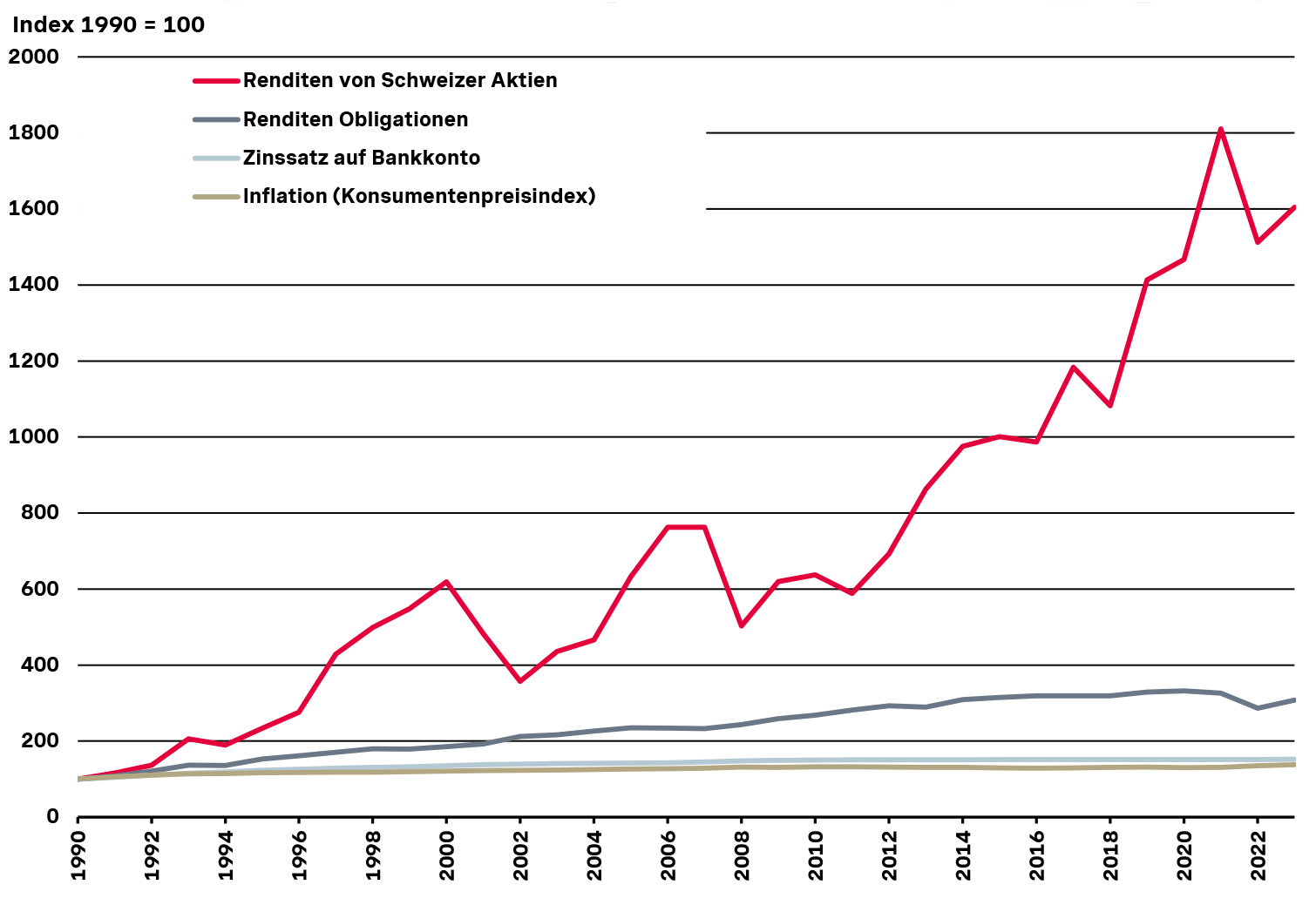 Starke Performance von Aktien im Vergleich mit anderen Geldanlagen zwischen 1990 und 2023