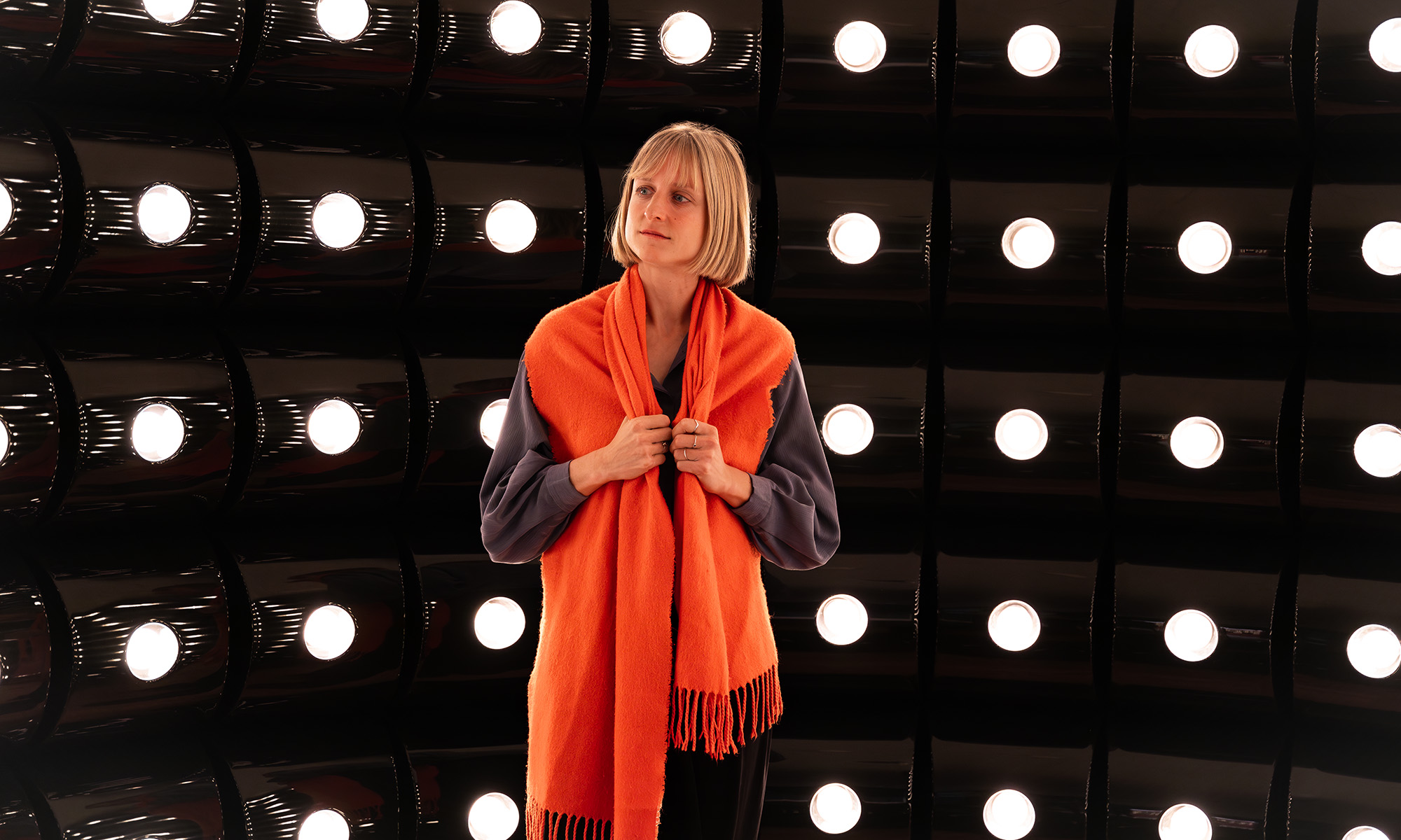 Kuratorin Katrin Sperry in Mitten einer Kunstinstallation im Vorraum des Tresorraums am BEKB-Standort in Biel.