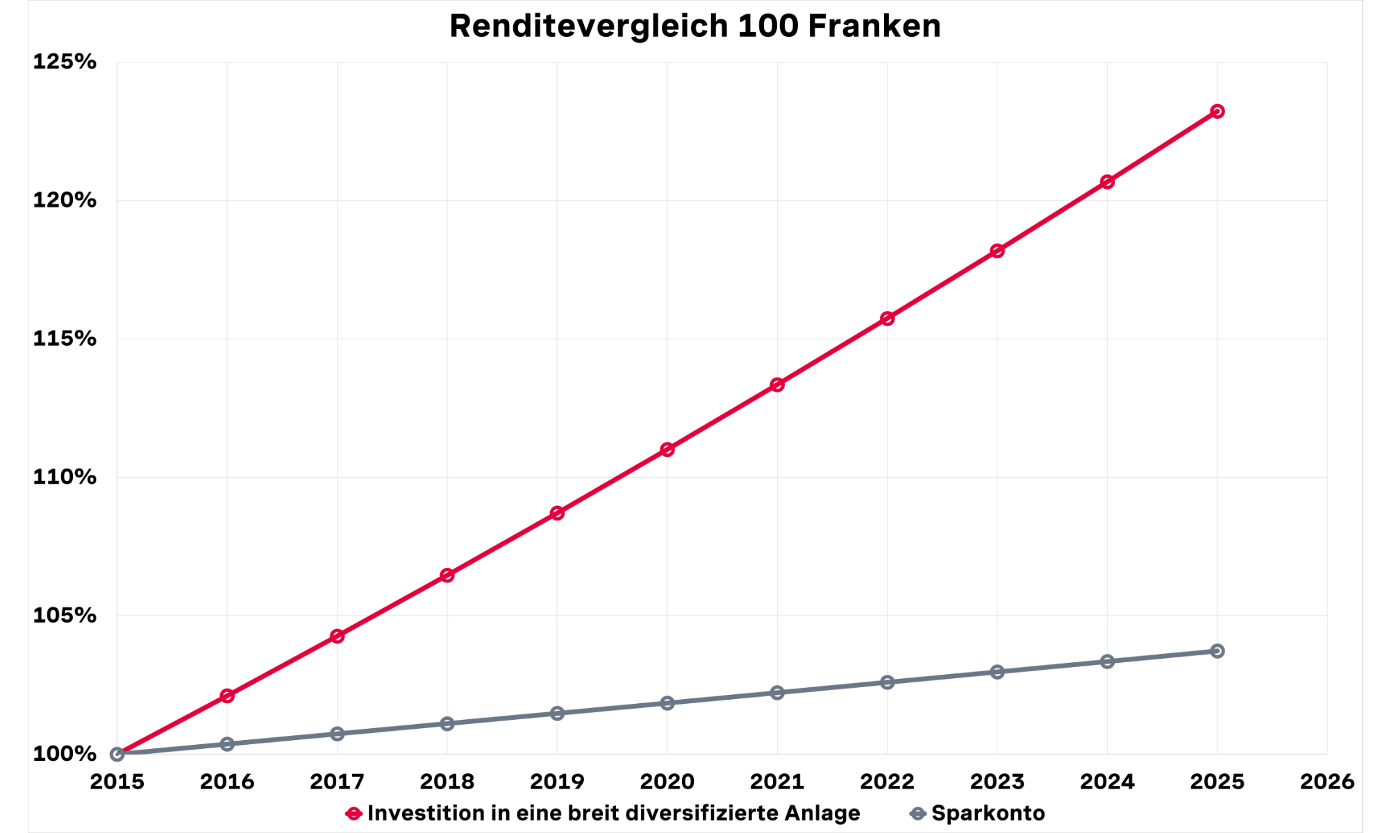 Ein Beispiel macht es greifbar: Die Grafik «Renditevergleich 100 Franken» zeigt den Zinseszinseffekt sehr schön. Die graue Linie steht dabei für die Entwicklung einer Einlage von 100 Franken über die letzten zehn Jahre mit einem durchschnittlichen Zinssatz eines Sparkontos. Die rote Linie hingegen zeigt die Entwicklung einer Investition von 100 Franken in eine breit diversifizierte Anlage an den Finanzmärkten, berechnet anhand historischer Marktdaten und nach Abzug typischer Kosten. Die Darstellung dient der Veranschaulichung und stellt keine tatsächliche Fondsperformance dar. Wertschriftenanlagen unterliegen Schwankungen, Verluste sind möglich.