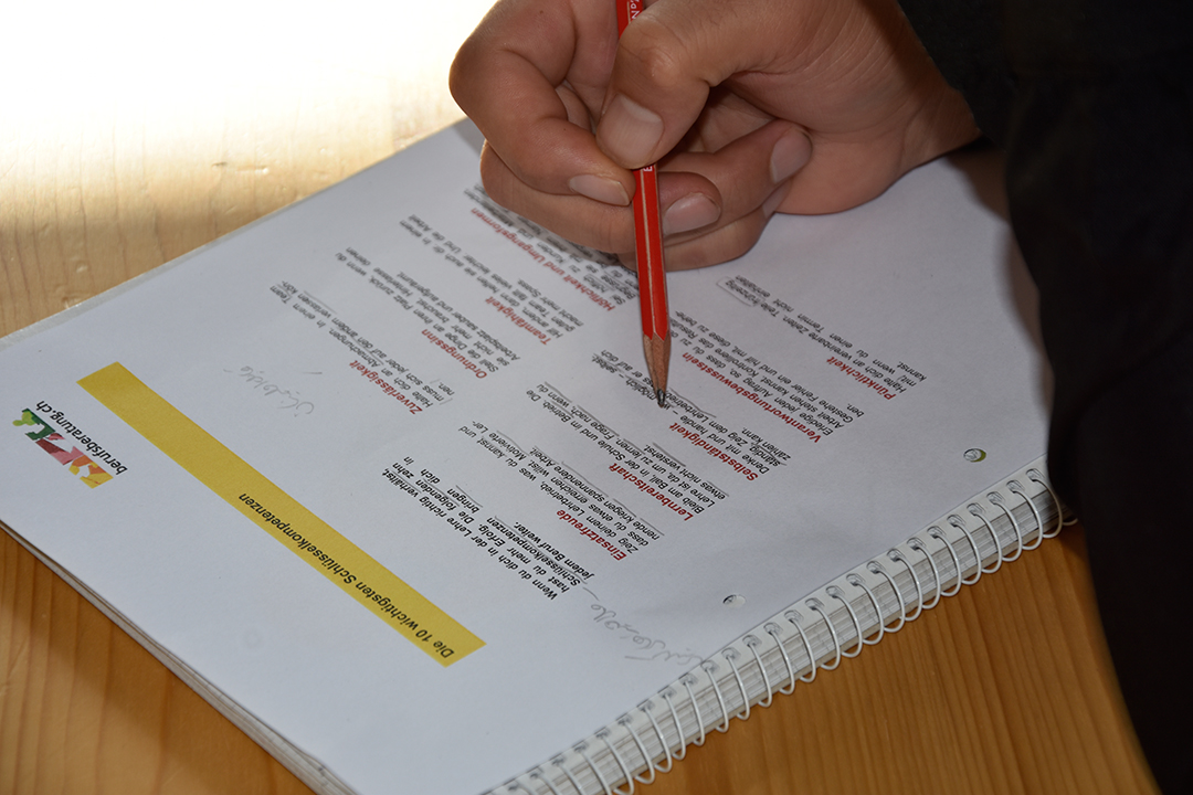 Daneben stehen auch noch Mathematik, IKT (Informations- und Kommunikationstechnologien) und Deutsch auf dem Stundenplan. «Die Flüchtlinge, die zu HandsOn kommen, verfügen bereits über erste Deutschkenntnisse. In dem Jahr, in dem sie hier sind, arbeiten wir mit ihnen auf ein Niveau B1 hin. Das ist die Voraussetzung, um nachher eine Lehrstelle finden zu können,» so Jonathan Wüthrich. Und genau das ist das Ziel: Nach ihrer Zeit bei HandsOn sollen die Flüchtlinge fit für den Arbeitsmarkt sein und eine Lehre beginnen können. Je nach dem absolvieren sie zuerst eine einjährige Vorlehre oder steigen direkt in eine Lehre mit Berufsattest oder sogar mit Eidgenössischem Fähigkeitszeugnis ein.