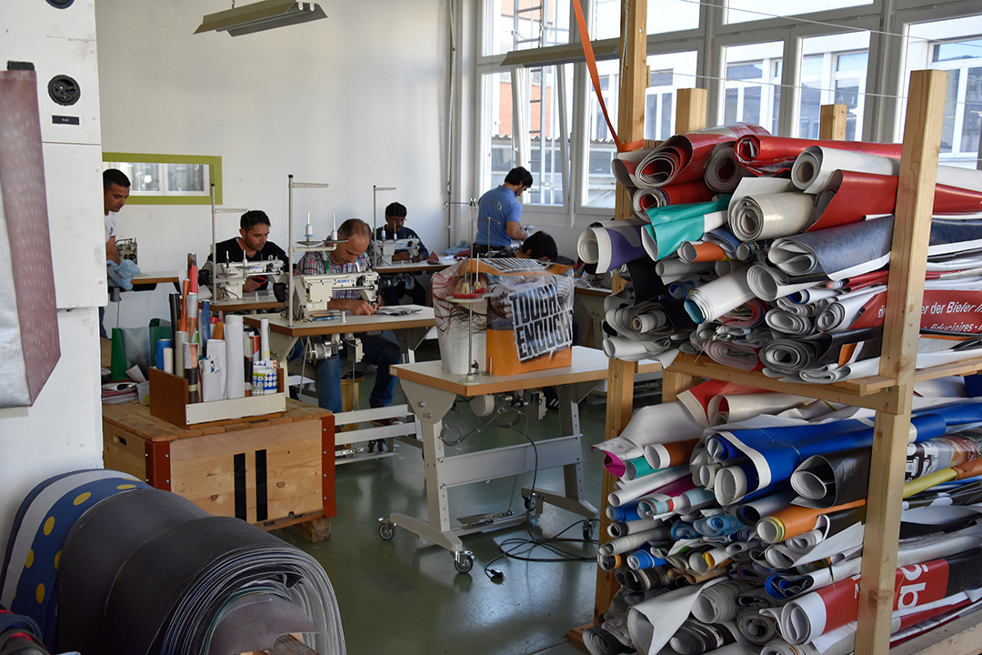 Bei HandsOn arbeiten die Flüchtlinge im Textilbereich und fertigen Taschen, Rucksäcke und viele andere Produkte aus Werbeblachen. Das Material kommt von Druckereien oder direkt von Unternehmen, die nach dem Ende einer Werbekampagne ihre Werbeblachen nicht mehr benötigen. Jonathan Wüthrich: «Bei der BEKB war es zum Beispiel so, dass wir die riesige Werbeblache im Wankdorf gesehen haben. Da haben wir einfach mal angefragt, ob wir die Blache nach der Kampagne weiterverwerten können. Die BEKB hat die Idee mit Begeisterung aufgenommen.» Aus einem Teil der Blache lässt sie als Auftragsarbeit einige Tausend Etuis anfertigen, die sie anschliessend weiterverteilen wird. Der Rest wird vorübergehend für weitere Projekte eingelagert.