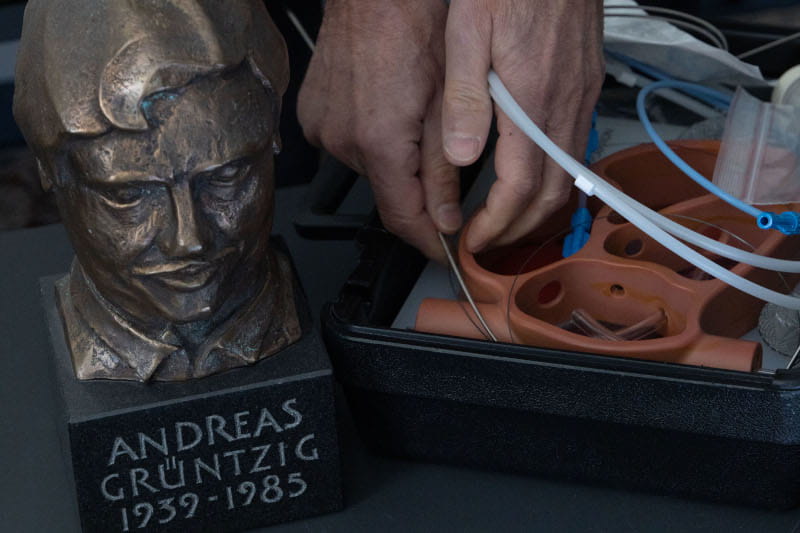 Aber zurück zu Andreas Grüntzig. Auf einem Tisch in der Ecke des Büroraumes steht eine Messingskulptur von Grüntzigs Kopf. Ein Zeichen tiefer Verbundenheit: «Beruflich verdanke ich ihm alles», meint der Facharzt und setzt sich neben die Skulptur. Grüntzig entwickelte 1976 eine bahnbrechende Methode zur Behandlung der häufigsten Todesursache der Menschen, der koronaren Herzkrankheit, und «ich begab mich gleich von Anfang an in sein Schlepptau und habe alles miterlebt», erzählt Berni. Im September 1977 wagte Grüntzig eine erste Operation mit der von ihm erfundenen Ballondilatation zur Aufdehnung verengter Herzkranzgefässe. Die Operation war ein Erfolg, der Patient lebt bis heute. «Alle, die an diesem Tag Zeugen dieser kleinen Revolution wurden, treffen sich immer noch jährlich zum Jubiläum.» Leider schon lange ohne Andreas Grüntzig; der Arzt kam keine zehn Jahre nach seiner Erfindung im Alter von 46 Jahren bei einem Flugzeugabsturz ums Leben. Sein Erbe wird indessen täglich weltweit bei Hunderttausenden Patienten angewendet, um Leben zu retten.