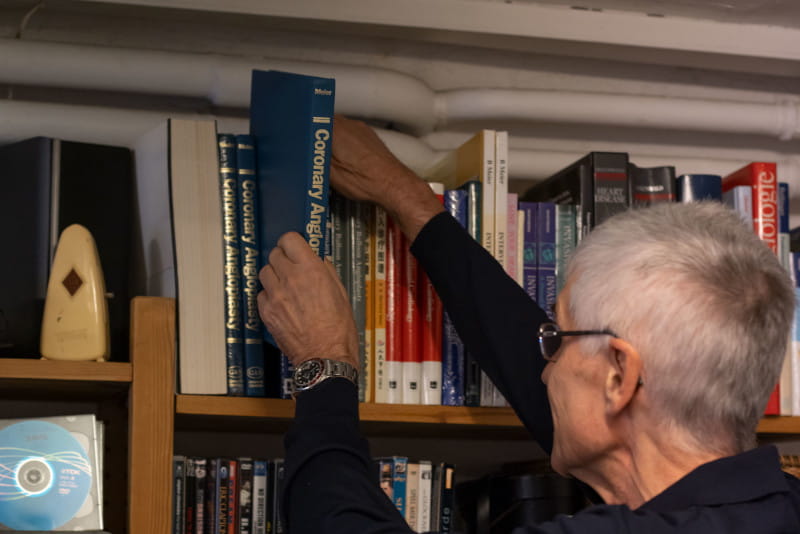 Berni lehnt sich ans Bücherregal. Diese Bücher sind alle zumindest teilweise aus seiner Feder und wurden in viele Sprachen übersetzt: «Es gab mal eine Zeit, wo dieses Buch rund um den Globus in fast allen Büros von Kardiologen stand, die sich mit der Behandlung der koronaren Herzkrankheit beschäftigten», er öffnet ein Buch mit dem Titel «Coronary Angioplasty». «Ich vermute, es ist mittlerweile vergriffen. Die Leute, die es haben, sind vermutlich auch alle pensioniert.» Auf der ersten Seite des Buches steht die Widmung «To my wife Monika».