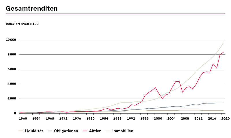 Ein Blick auf die Gesamtrenditen seit 1960 zeigt die starke Entwicklung von Aktien deutlich auf. Ihre Gesamtrendite fällt weit höher aus als mit einem Sparkonto – und bleibt nur knapp hinter der von Immobilien zurück. Zwar weisen Aktienrenditen vergleichsweise grosse Schwankungen auf, in Kombination mit anderen Anlageklassen wie Obligationen oder Immobilien-Fonds bieten sie jedoch ein sehr ansprechendes Rendite-Risiko-Profil.