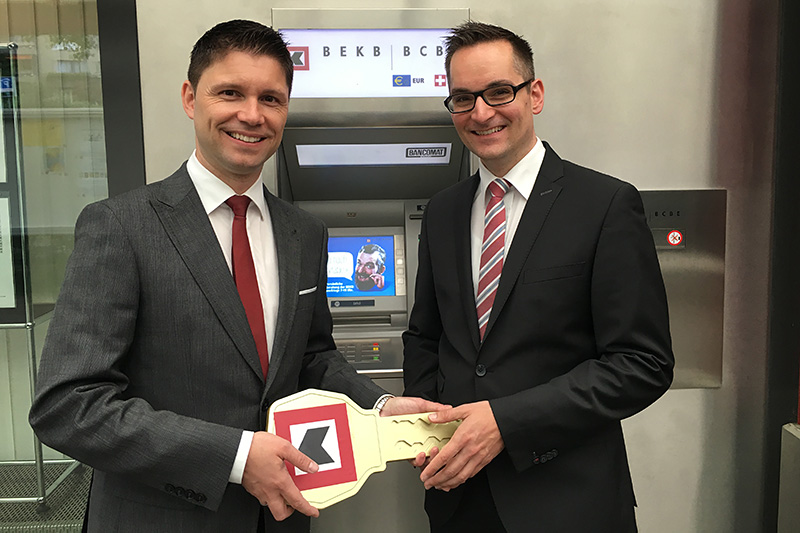 Christian Balmer (links) übergibt seinem Nachfolger Marcel Zürcher den Schlüssel für die BEKB-Niederlassung Ittigen.