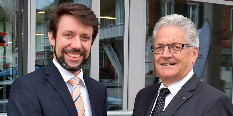 Niklaus Luginbühl (rechts) übergibt seinem Nachfolger Philipp Christen die Niederlassung der BEKB Steffisburg.