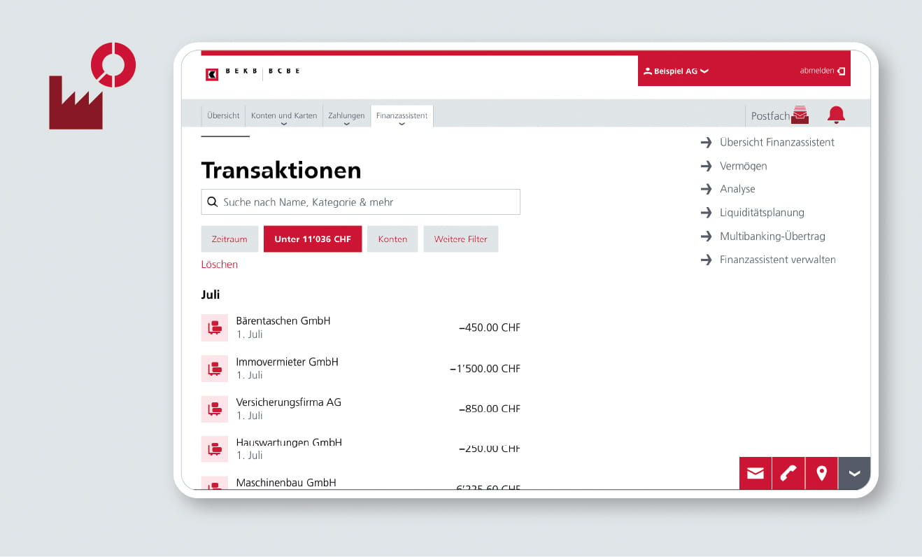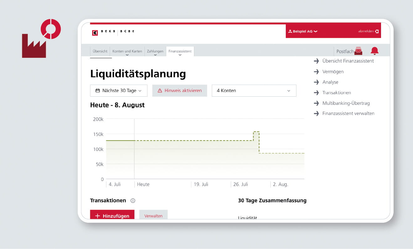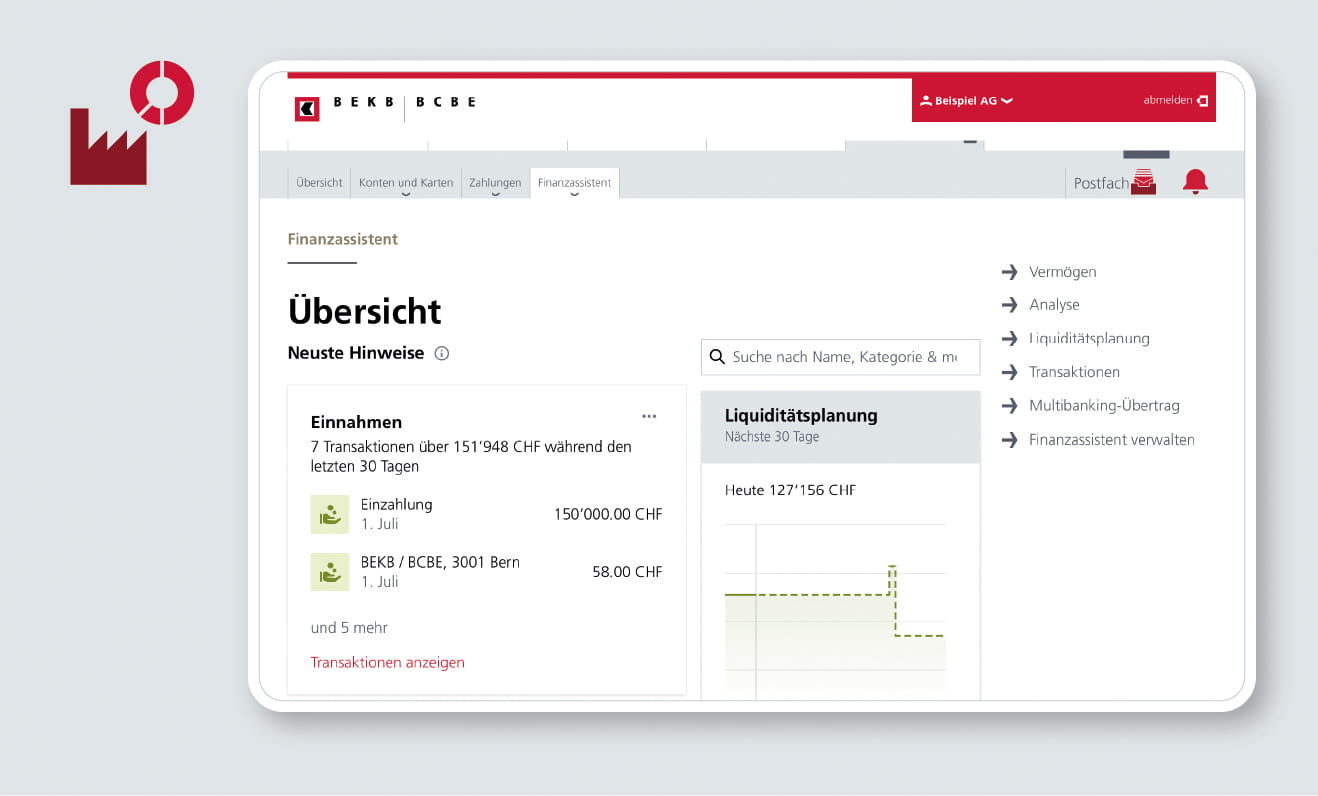 | BEKB E-Banking | Der Finanzassistent für KMU wird für Sie automatisch im BEKB E-Banking aktiviert. Sie finden ihn im entsprechenden Menüpunkt. |