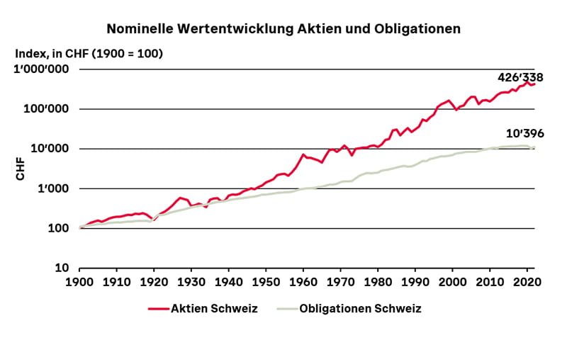 Konkret kletterte der Schweizer Aktienindex zwischen 1900 und 2023 mit zeitweisen Rückschlägen immer weiter in die Höhe. Anlegerinnen und Anleger, die über diesen ganzen Zeitraum in Schweizer Aktien investiert waren, konnten ihr Geld vervielfachen. Aus anfänglich 100 investierten Franken wurden über die Zeit rund 426’000 Franken! Dieselbe Anlage in CHF-Obligationen hätte «nur» rund 10’000 Franken ergeben.