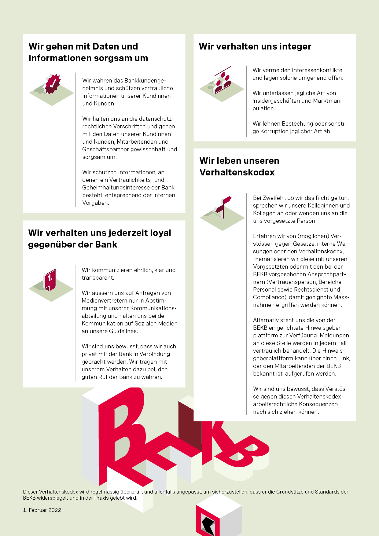 Die Vision umschreibt das langfristige Streben der BEKB zur Begeisterung ihrer Kundinnen und Kunden und Mitarbeiterinnen und Mitarbeiter. Die Werte stellen die nachhaltige Entwicklung sowie das Wohl aller Anspruchsgruppen in den Mittelpunkt.