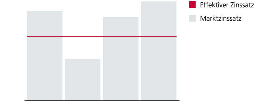 Die Renovationshypothek ist eine attraktive Festzinshypothek mit fixem Zinssatz für eine festgelegte Laufzeit. Und zwar auch schon für Tranchen unter 100'000 Franken. Sie können dadurch über die gesamte Dauer mit denselben Zinskosten rechnen und sich so gegen steigende Zinsen absichern.