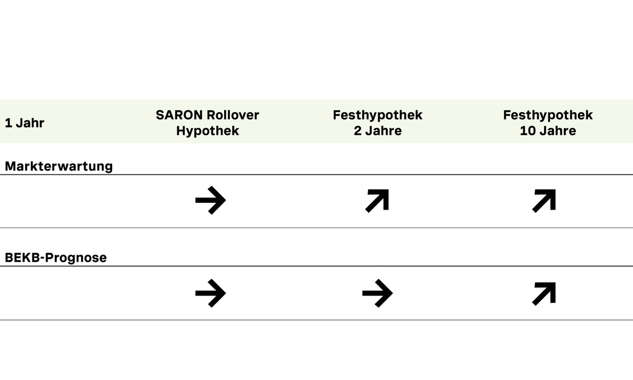 In den nächsten Monaten rechnen wir mit einem Seitwärtstrend oder einem leichten Anstieg bei den mittel- bis langfristigen Zinsen. Für Hypothekarnehmerinnen und Hypothekarnehmer mit einer durchschnittlichen Risikobereitschaft eignen sich in solchen Zeiten die Kombination einer Geldmarkthypothek (SARON Rollover Hypothek) mit einer Festzinshypothek.