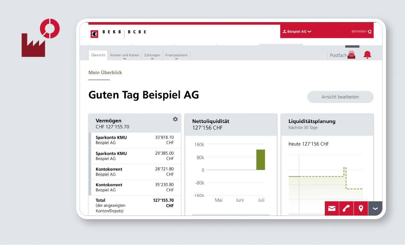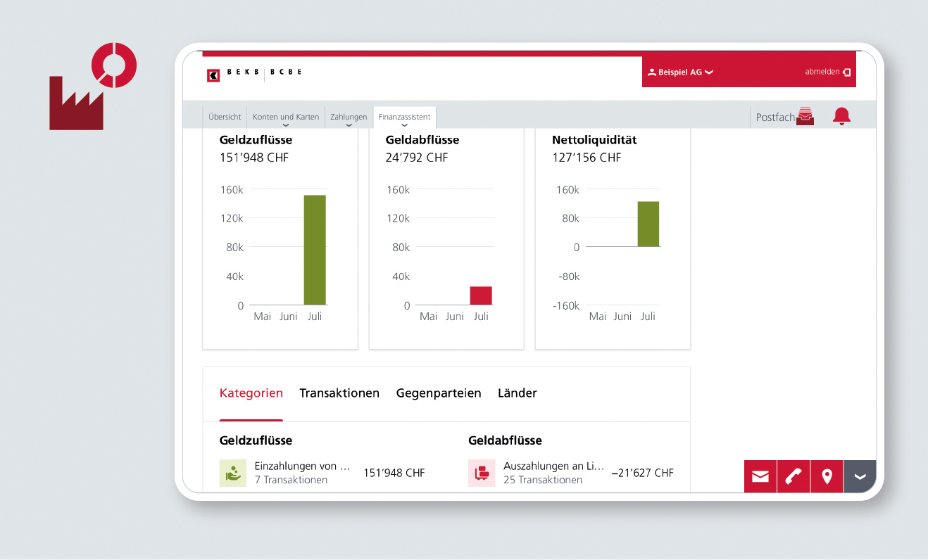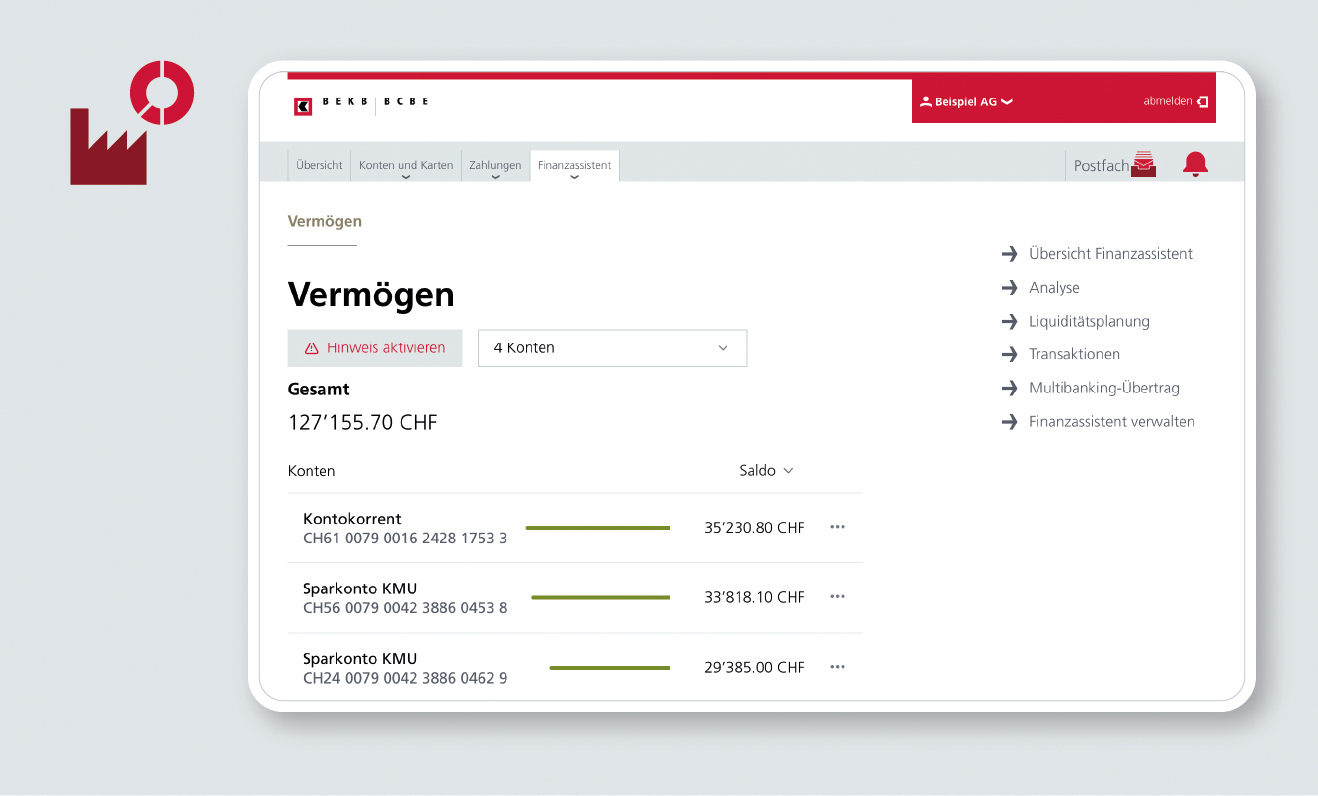 | BEKB E-Banking | Der Finanzassistent für KMU wird für Sie automatisch im BEKB E-Banking aktiviert. Sie finden ihn im entsprechenden Menüpunkt. |